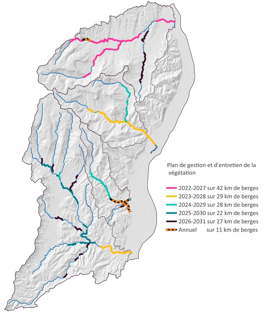 Le SMCR gère 160 km de berges sur l'ensemble de son territoire d'intervention. Chaque année, la ripisylve d'une partie de ce linéaire est traitée. Si les secteurs fortement urbanisés sont traités chaque année, il faut généralement 5 à 6 ans pour gérer la végétation sur l'ensemble du linéaire, avant d'amorcer un nouveau cycle d'entretien.