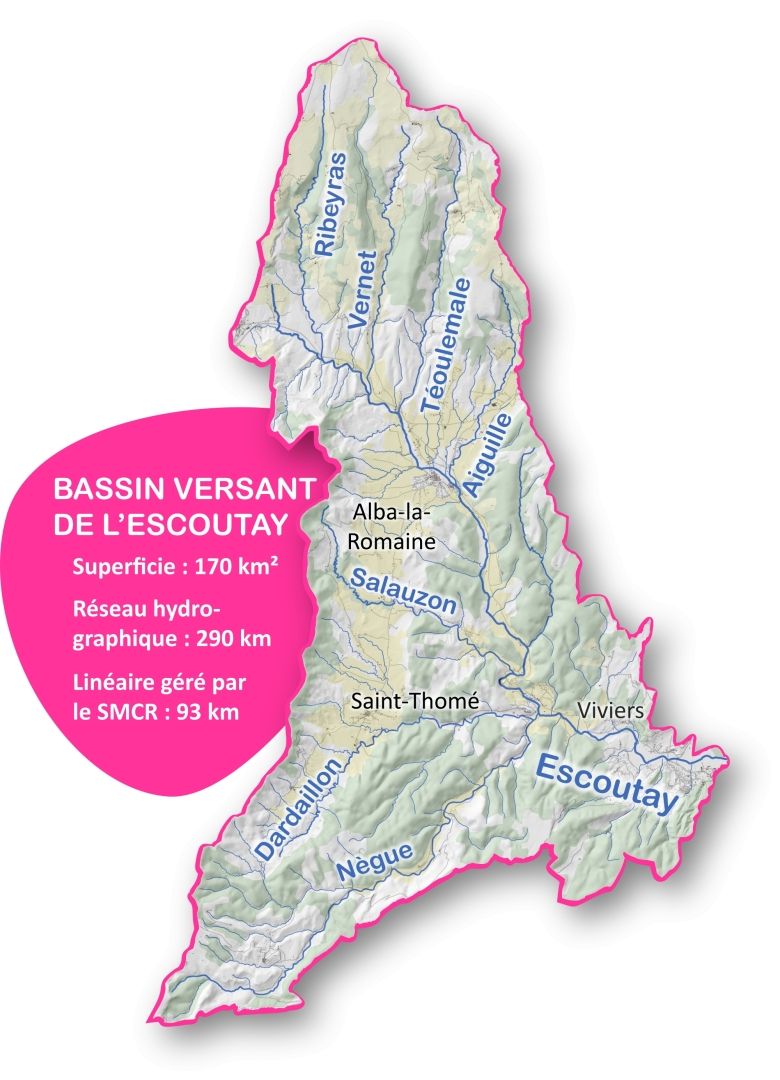 Réseau hydrographique géré par le SMCR : Escoutay (23km), Ribeyras (8,5km), Vernet (8,5km), Téoulemale (9,5km), Aiguille (7km), Salauzon (10km), Dardaillon (11km) et Nègue (15km)