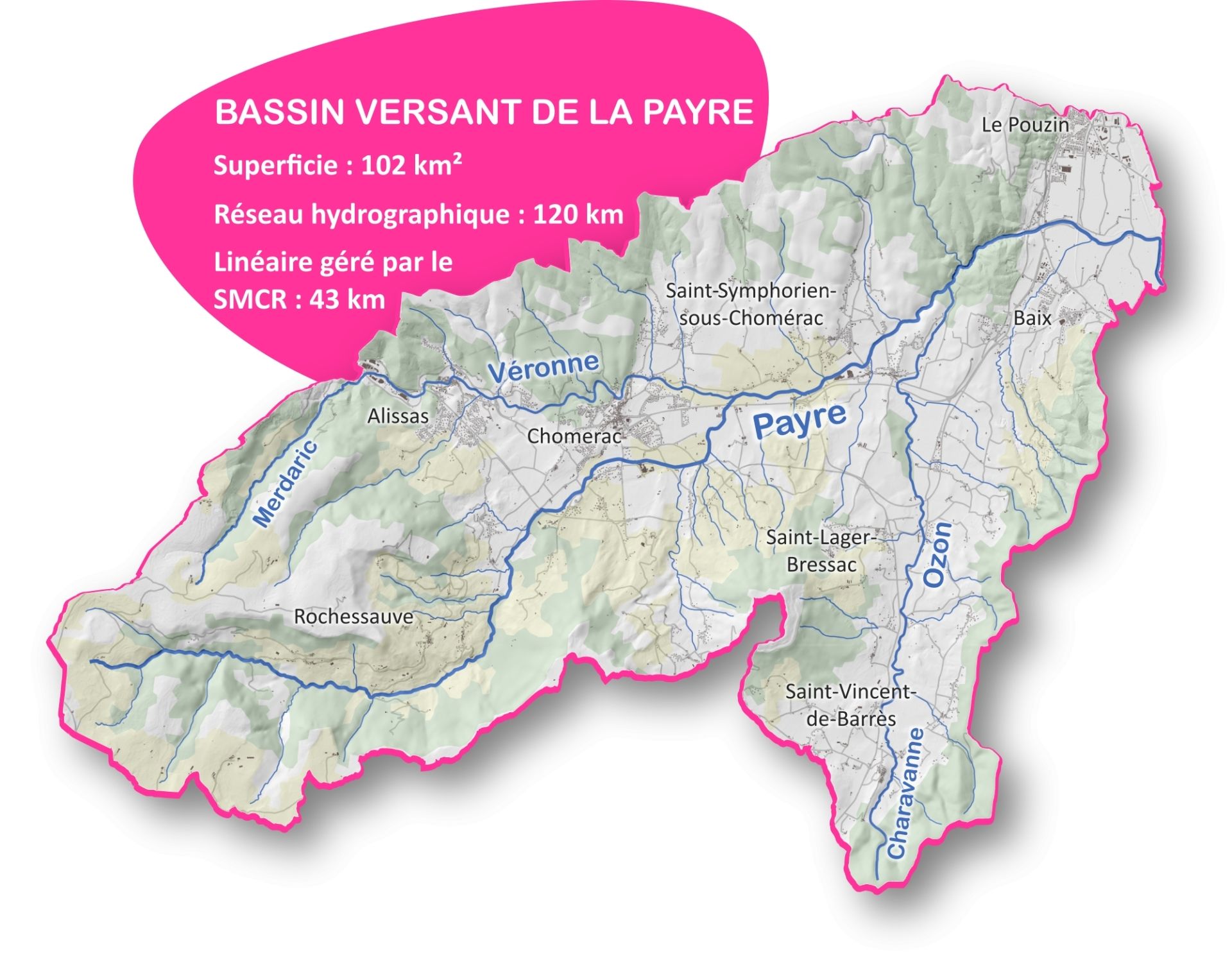 Réseau hydrographique géré par le SMCR : Payre (21,5km), Ozon (10,5km) et Véronne (11km)