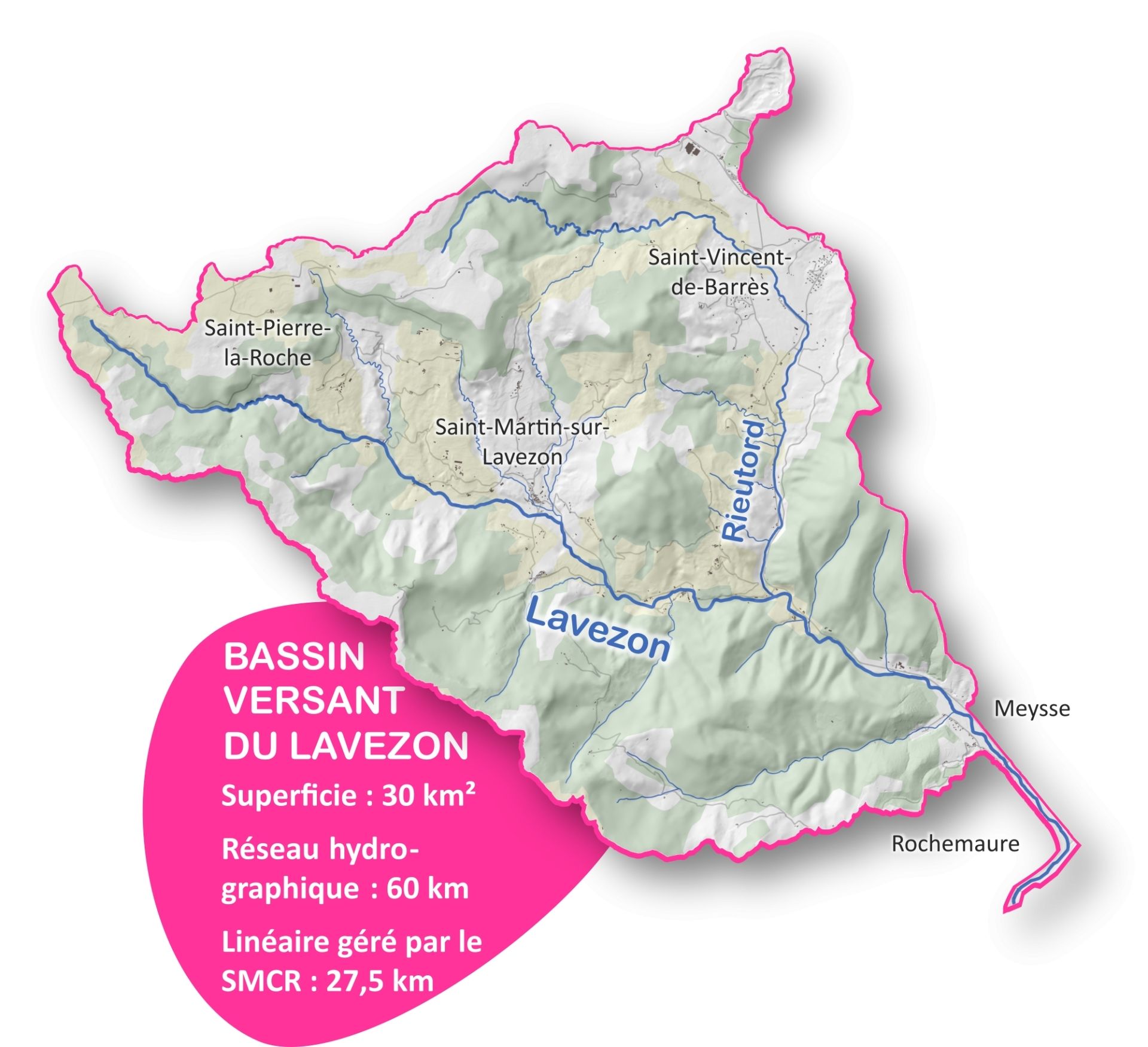 Le Lavezon, quant à lui, prend sa source sur la commune de Berzème (altitude de 700m). Ce cours d’eau collecte une dizaine d'affluents le long de son parcours de 17 km jusqu'à sa confluence avec le Rhône. Parmi ses affluents (45 km au total), son principal contributaire hydrologique et sédimentaire est le Rieutord. Ce réseau hydrographique draine un bassin versant de 60 km².