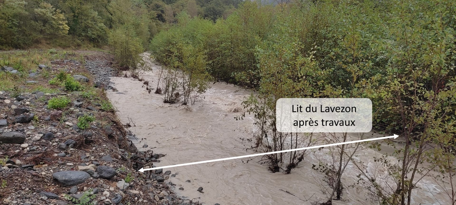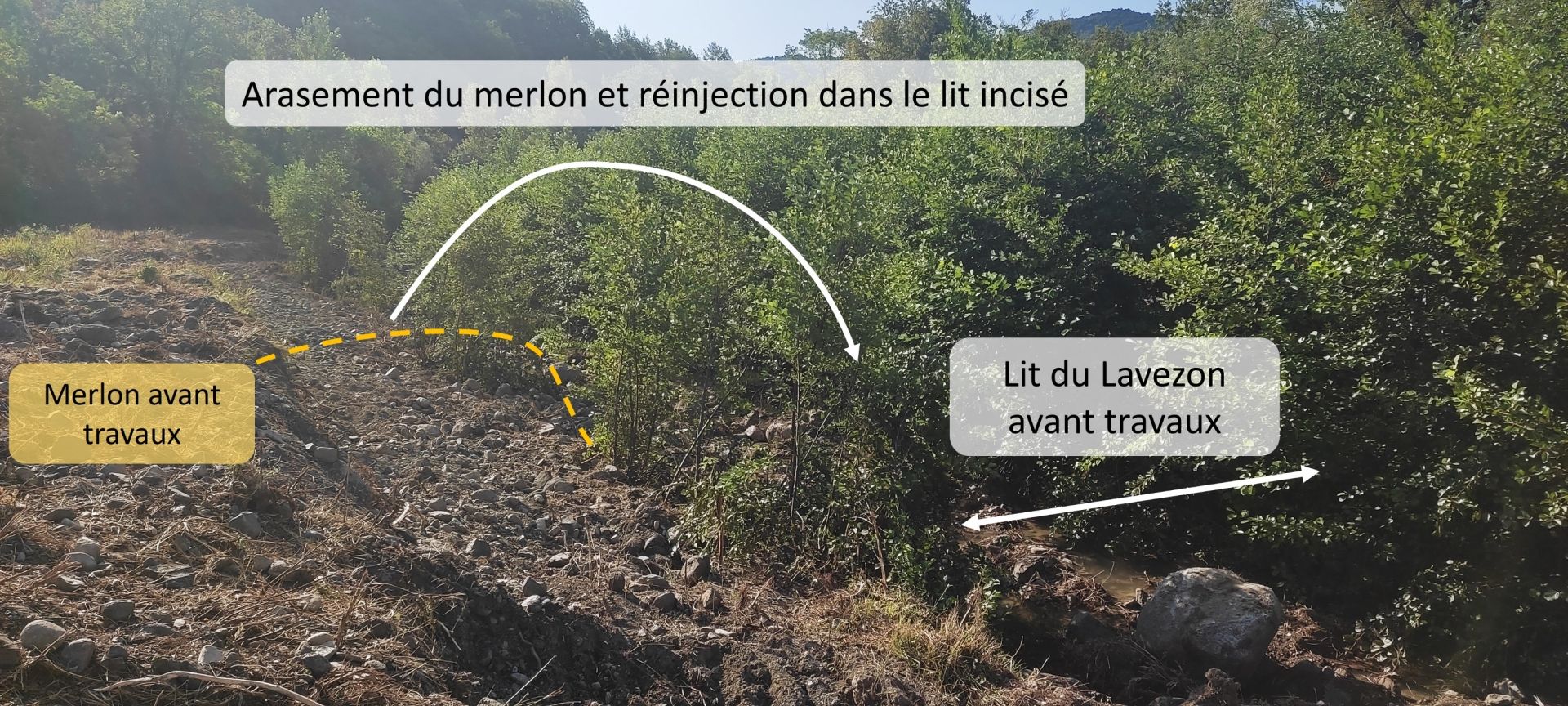 Il s'agit donc de restaurer l'espace de bon fonctionnement du Lavezon qui n'en occupe actuellement que 36%. Restaurer cet espace de bon fonctionnement favorisent, en outre, le remaniement des sédiments, déposés sur ces terrasses il y a plusieurs décennies. Cela permet d'améliorer le déficit sédimentaire du Lavezon et le rajeunissement tant des formes fluviales que des successions végétales qui s'y développent et, par conséquent, la biodiversité.